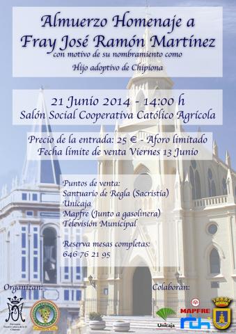 Por ello no podemos hacer menos que acompañarle en dicho día y hemos pensado en organizar un almuerzo homenaje, que se celebrará ese mismo día 21 de Junio, a las 14 horas en el salón social de la Bodega Cooperativa Católico Agrícola, en la Avenida de Regla, al cual os invitamos, pues es también un día grande e importante para todos los que conocemos a fr. José Ramón.