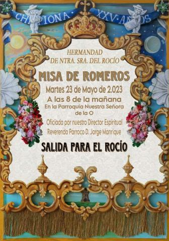 El próximo día 23 de mayo, martes, a las 8 de la mañana en nuestra parroquia y presidida por Nuestro Párroco. D. Jorge Manrique se celebrará la Solemne Eucaristía de Romeros para posterior mente realizar la salida de los romeros locales hacia el Rocío.