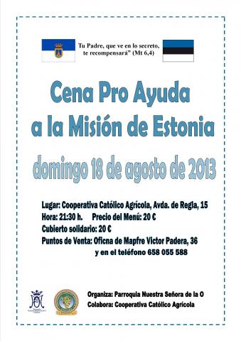 Chipiona, a 1 de agosto de 2013.- La Parroquia Nuestra Señora de la O de Chipiona en colaboración con la Cooperativa Católico Agrícola han organizado una cena benéfica pro ayuda a la misión Estonia el próximo 18 agosto a las 21:30 horas.