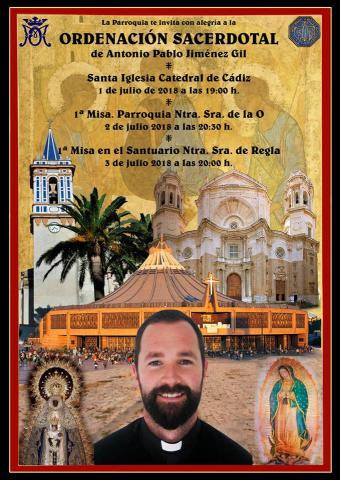 Con gran júbilo, la Parroquia invita a toda la feligresía a la Ordenación Sacerdotal de Antonio Pablo Jiménez Gil, que tendrá lugar, D.M. el domingo día 1 de julio de 2018 a las 19,00 h. en la Santa Iglesia Catedral de Cádiz.